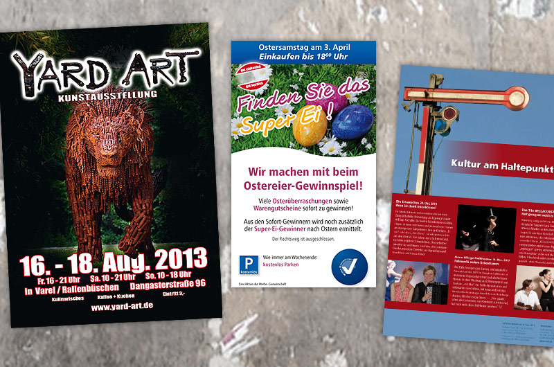 Flyer und Faltblätter Sie geben eine Ausstellung oder möchten eine Veranstaltung organisieren? Dann sollten Sie mit Handzetteln darauf aufmerksam machen! Nutzen Sie Faltblätter für ausführlichere Programmdetails oder als kleinen Ausstellungskatalog. Ideal sind Faltblätter auch für ein kurzes Firmenportrait.
