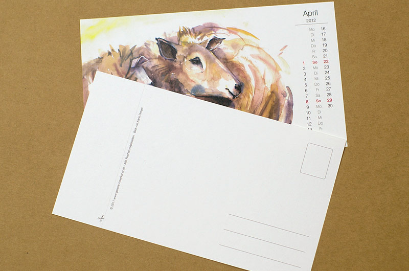 Auf Wunsch kann auch die Rückseite bedruckt werden. Hier ein Beispiel mit einem Postkartenaufdruck. Der Versender schneidet einfach das Kalendarium an der markierten Stelle ab und erhält so eine klassische Postkarte.